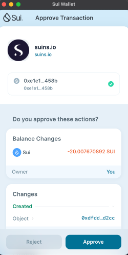 Upon choosing to register a name, users are directed to sign and submit a transaction to finalize the purchase, registration, and optionally, set the SuiNS as default. Once this process is completed, the SuiNS becomes owned, registered, and ready for use. Users can further inspect the SuiNS objects through explorers like Suiscan or SuiVision.