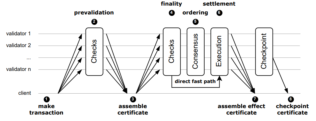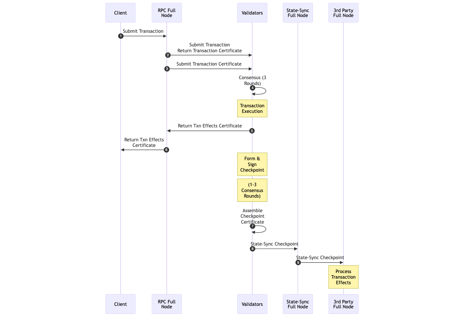 - RPC node broadcasts a transaction to the validators, which verify its validity and sign it, RPC node assembles transaction certificate from the quorum.