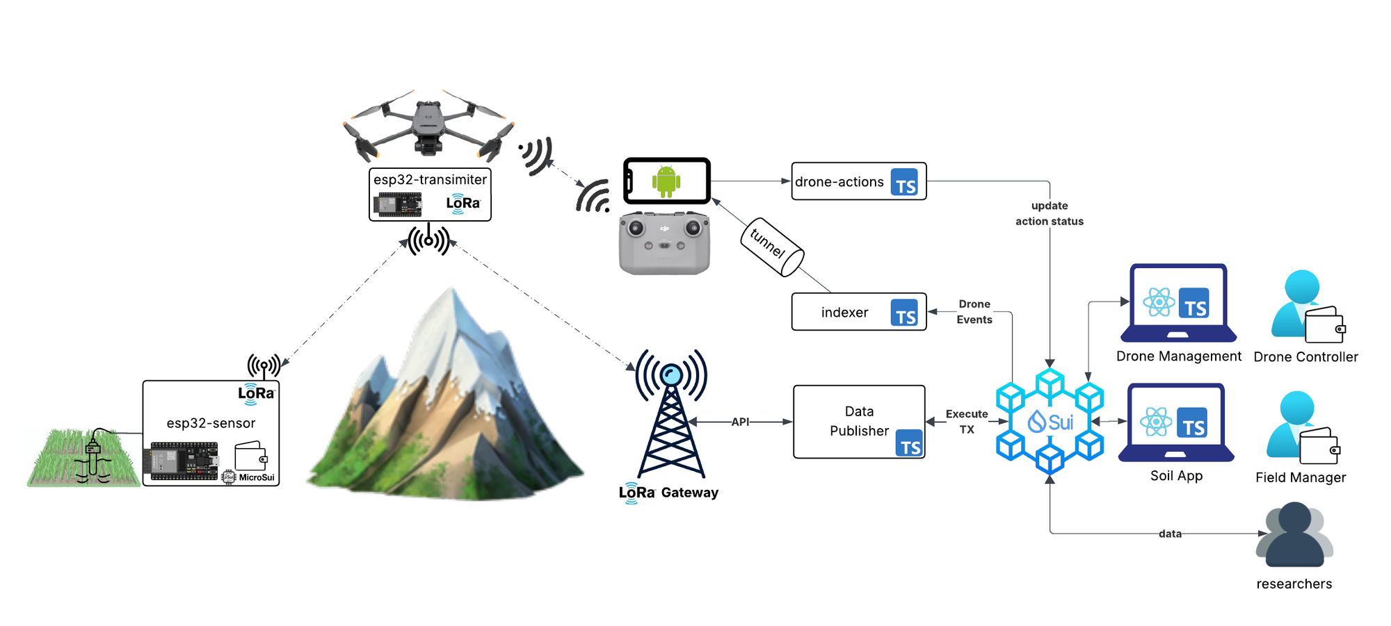 2. Drones as a last-resort “physical crane.” When radio waves failed, drones acted like a physical crane — picking up the signed message on one side of a ridge, carrying it over, and retransmitting it so the next relay could catch it. This could repeat through several hops until a gateway with internet access received the data and forwarded it to Sui validators. In effect, the drone became a mechanical extension of the network.