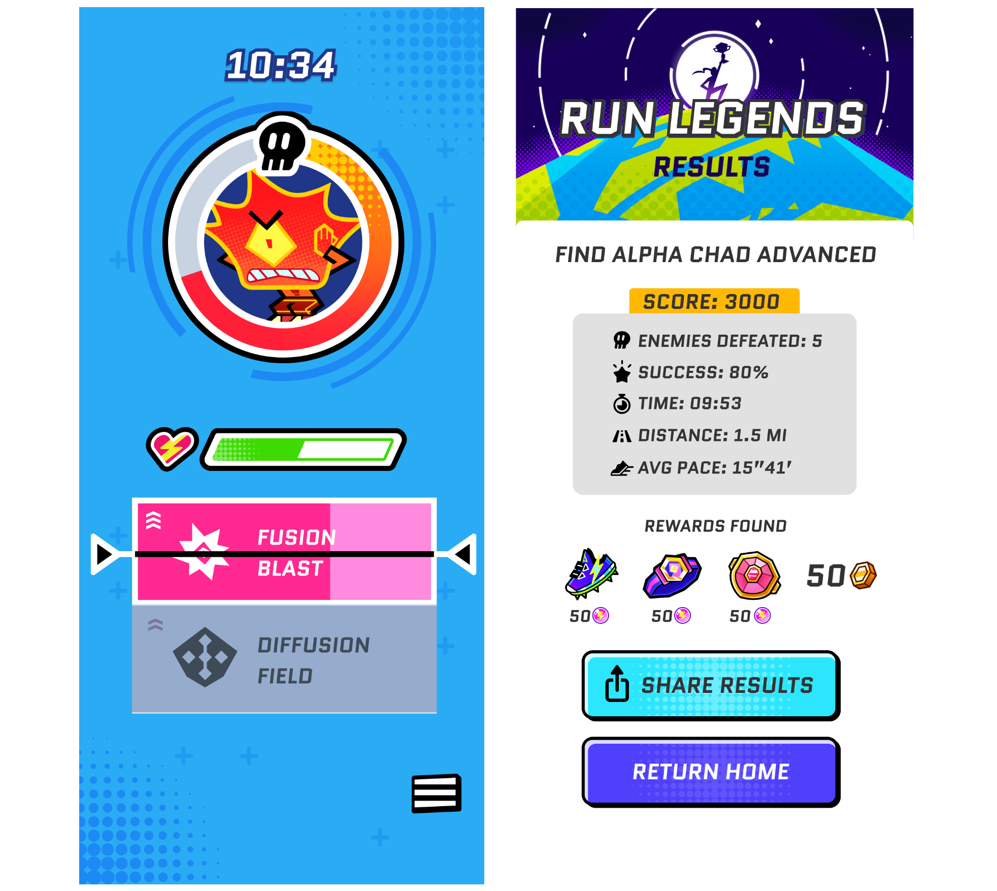 Run Legends is a battle game. You fight monsters in fun battles that are comedic in nature. When you go fast, you can trigger certain skills, so maybe dealing damage, and then when you go slow, you can trigger another skill such as healing your team and also doing some damage. Players choose to go fast or slow in real life which controls the gameplay, and that makes them think less about the exercise and more about playing a video game they love.