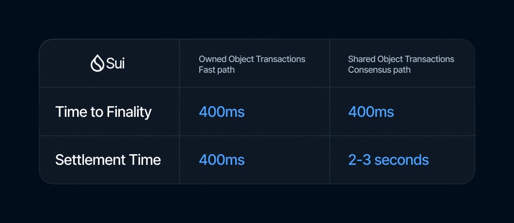 On Sui, the settlement path of a transaction hinges on the object types involved. Sui's transaction processing model lets owned objects follow the fast path, while those involving shared objects require consensus validation. Despite the path taken, TTF remains consistent at approximately 400 milliseconds. Owned object transactions also achieve settlement at this point. However, shared object transactions require consensus validation, pushing settlement time to 2 to 3 seconds.