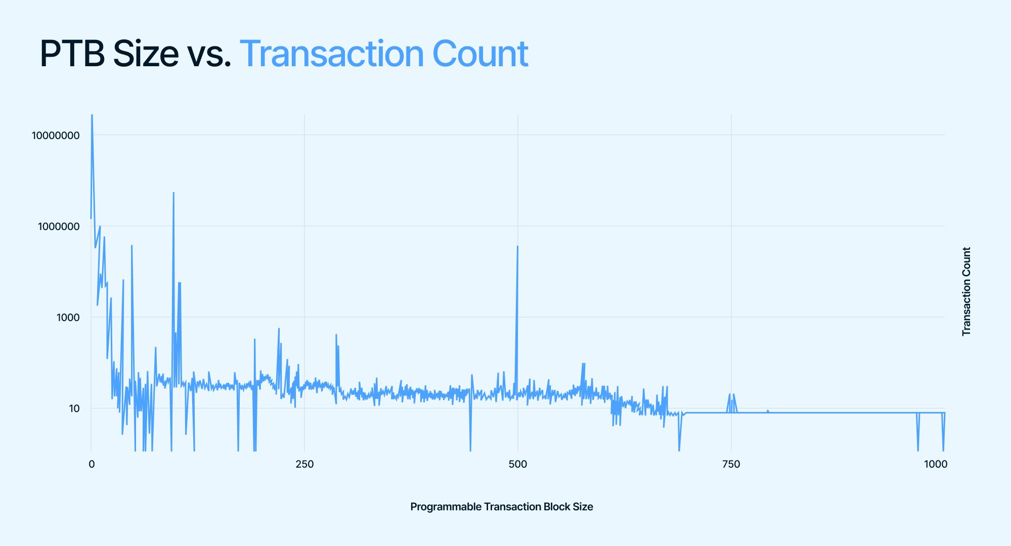 Due to Programmable Transaction Blocks’ convenience and power, developers on Sui are constructing increasingly sophisticated Programmable Transaction Blocks that are customized for their applications. Sui’s programmability was highly expressive even before PTB, but now a single execution can perform up to 1024 heterogeneous operations, each of which would otherwise be an individual transaction on most other blockchains. Although this feature has only been live in Sui public Testnet for about one month, Sui developers are already exploring a variety of PTB sizes, even in the range of 500 - 1000 (example 1, example 2, example 3). The following graph illustrates the current distribution of PTB Size on Testnet: