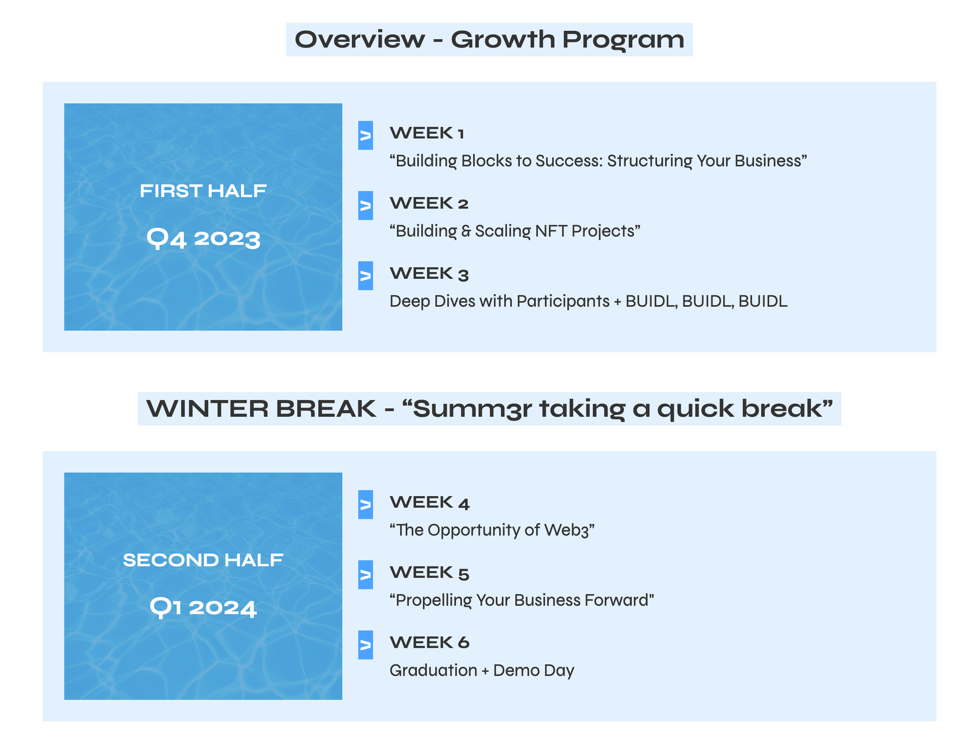 - Six-week dedicated support and access to the SUMM3R team including 20 live sessions, AMAs, and panel discussions with Web3 industry experts and mentors focused on business scaling, strategy, marketing, community engagement, tech development, Sui landscape/dynamic NFTs, partnerships, and fundraising